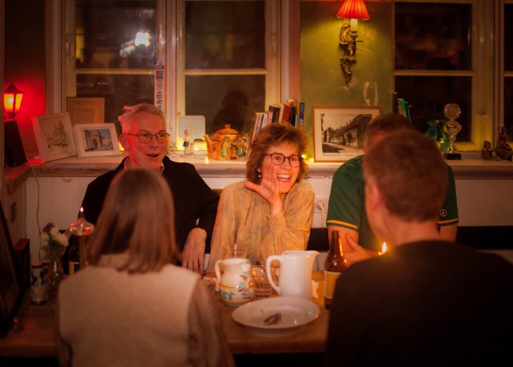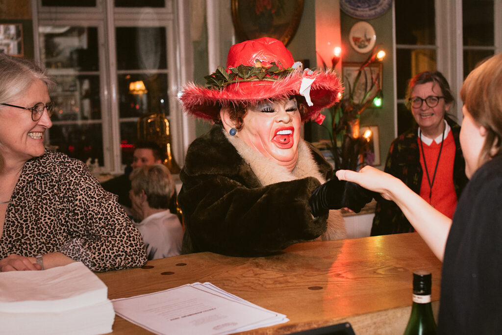 Vi åbner dørene kl. 19:00, hvor aftenen begynder stille og roligt med mad, snak, sang og varme i stuerne. Ved 21-tiden begynder maskerne at kigge forbi, og frem mod 23:45 samles de alle til Maskefald i Salen, som fortsætter til efter midnat.Derfor serverer vi 7 små retter, stille og roligt over mange timer, så der er god tid til både maden, maskerne og hyggen – med Gertrud, svigermor Rie fra Ringkøbing og Maskerne undervejs.
